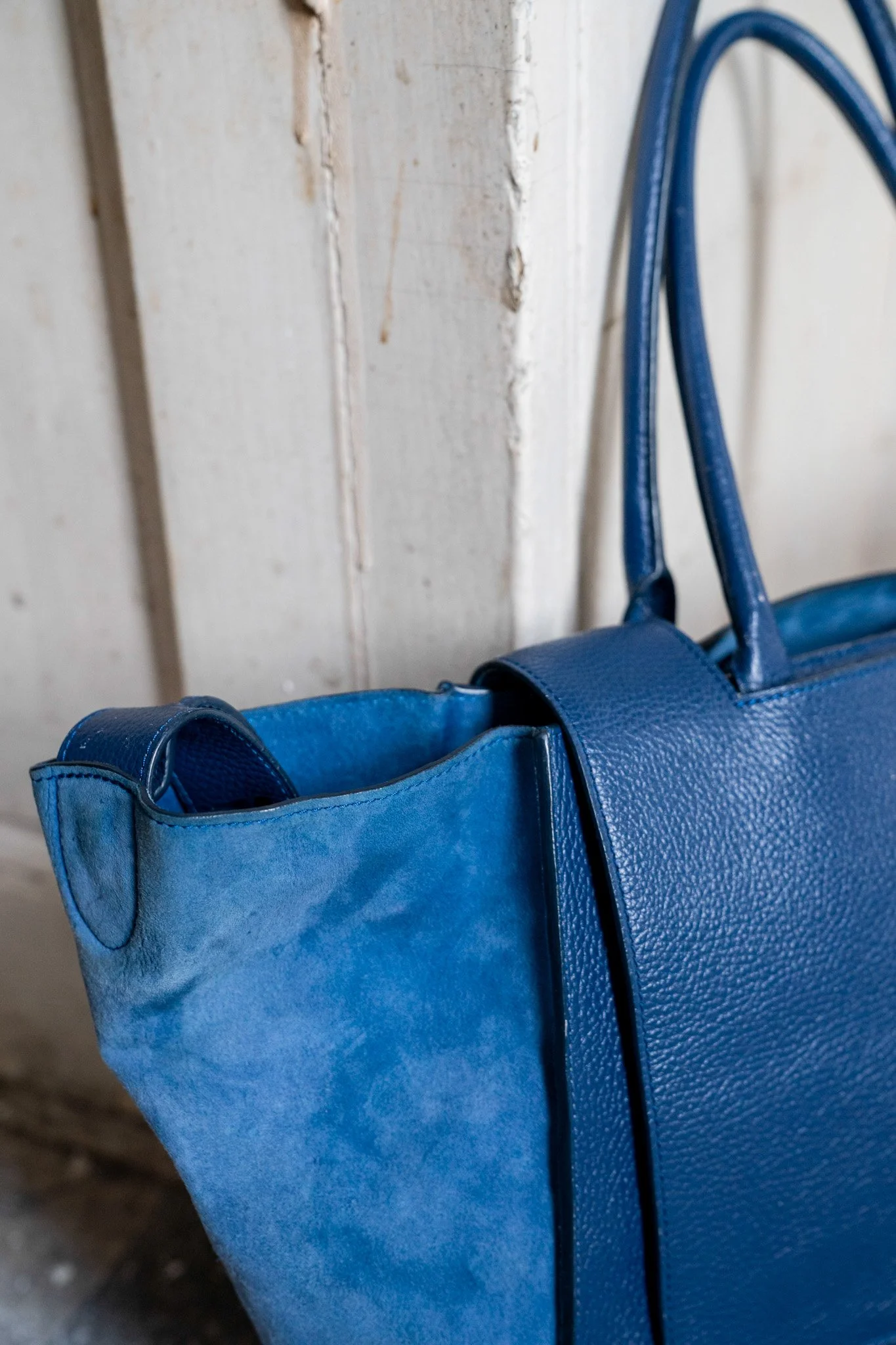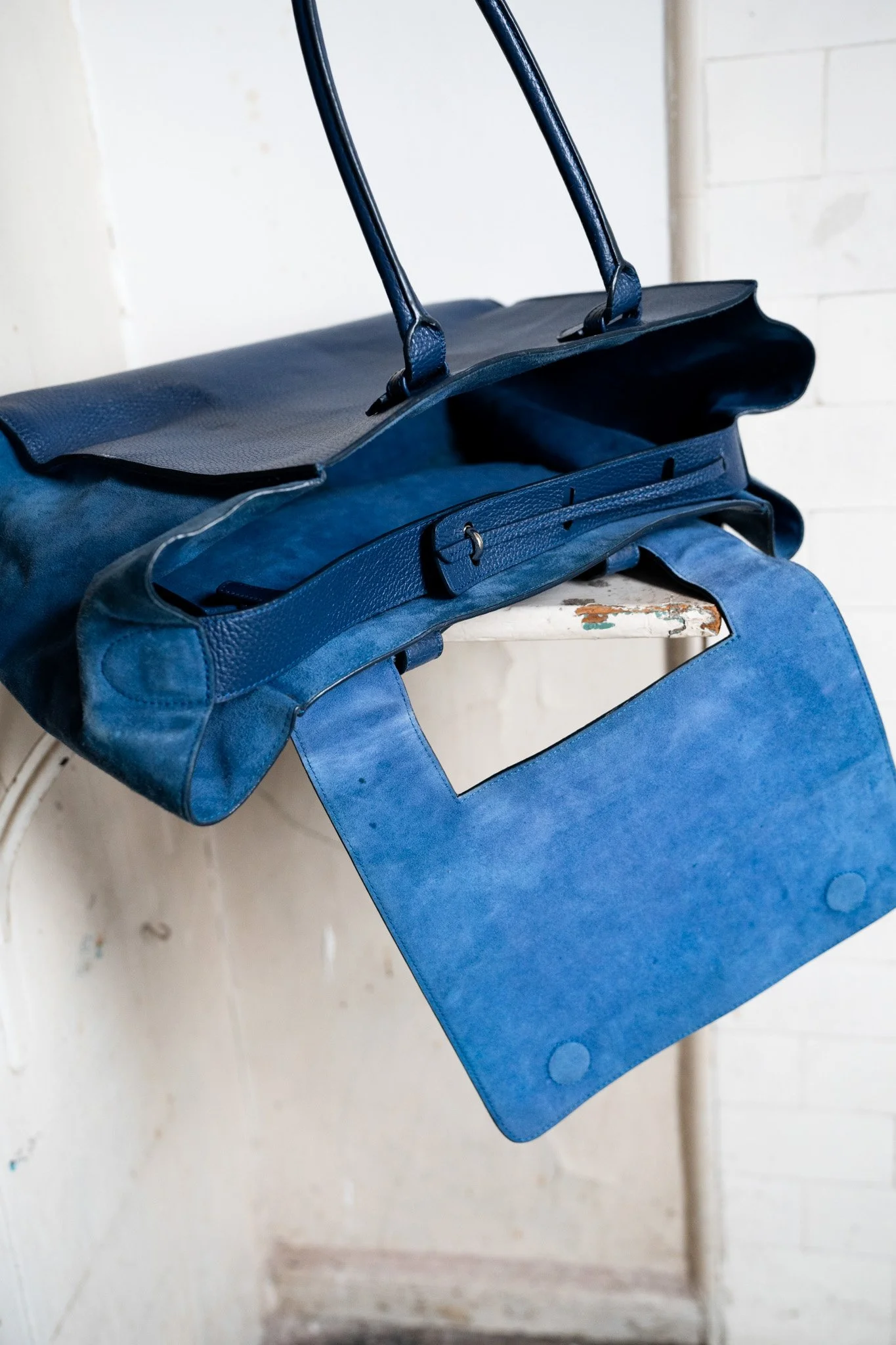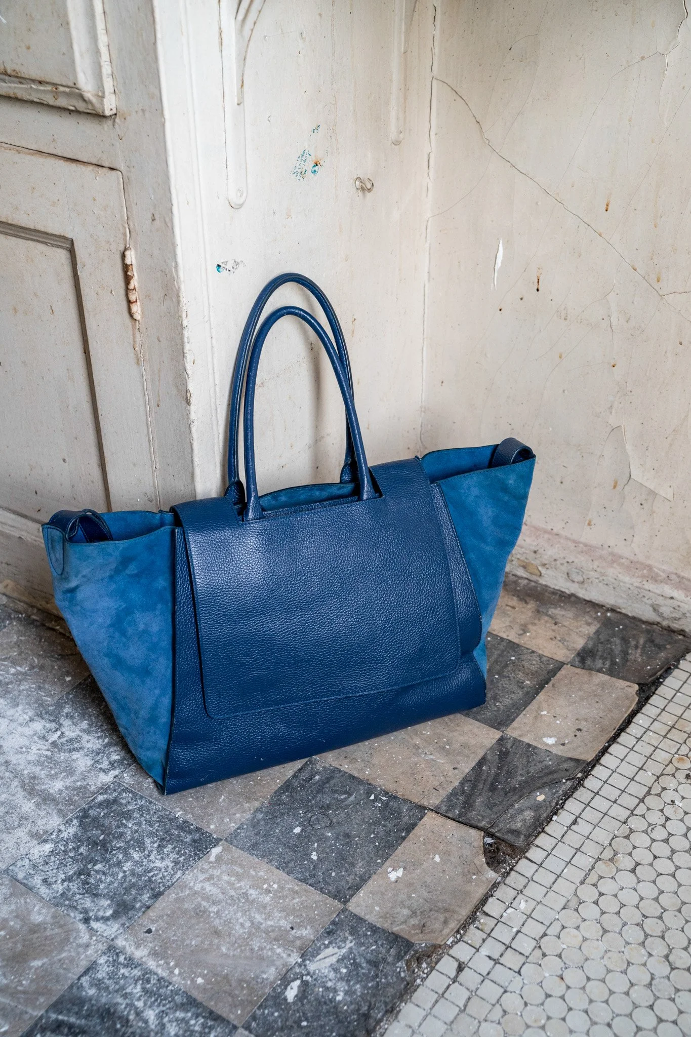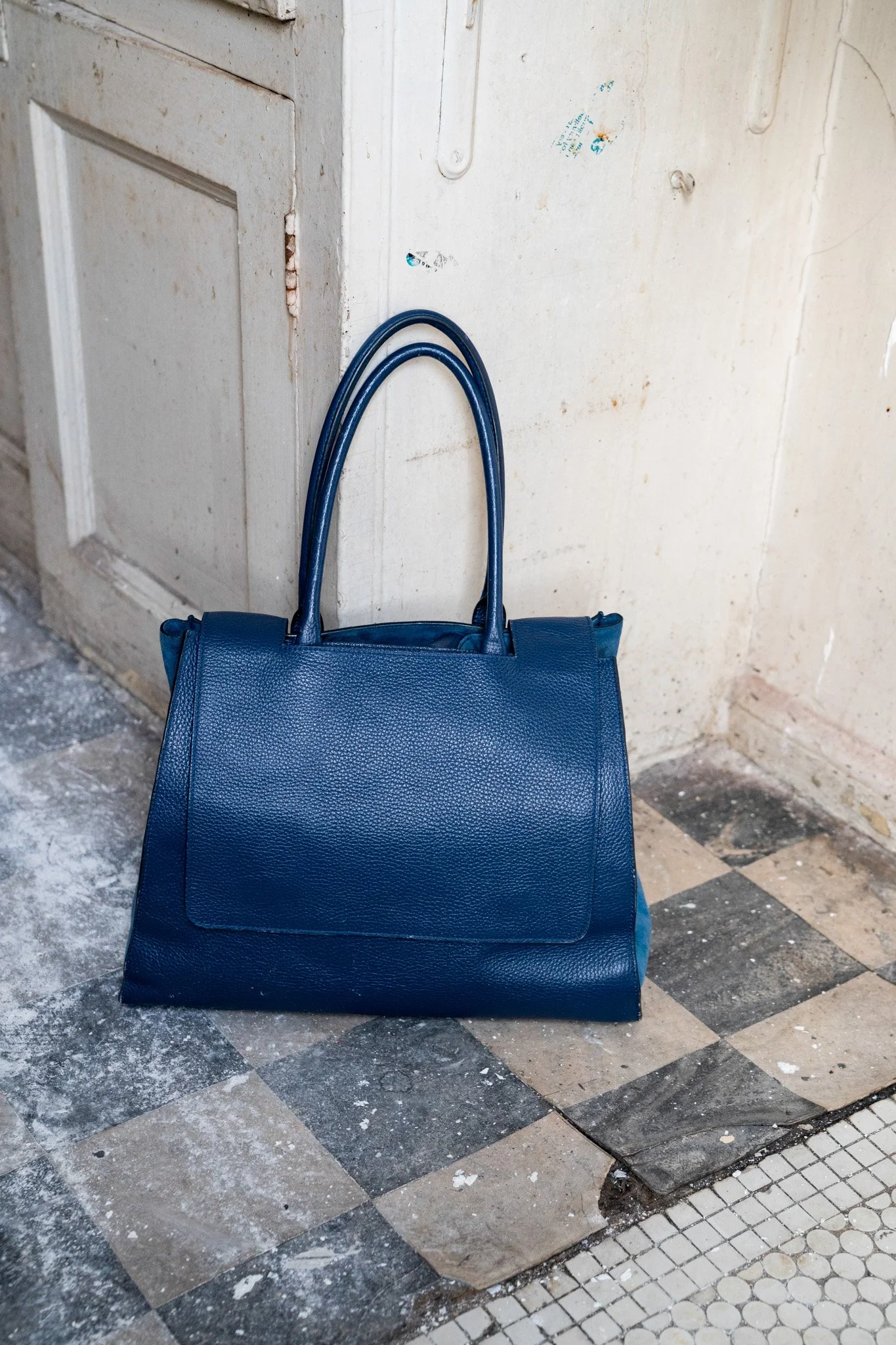 Tired of the ubiquitous capacious slouchy hobo, Bag 001 was born from the desire for a work bag that could fit all the necessary items while retaining a certain feminine elegance and form. Starting with a bold, slightly structured shape, side gussets were added that fold in or out allowing the bag to contract and expand as needed. With no hardware, the handles are thread through a clever fold-over to close the bag. It is roomy enough for the laptop, notebook and even a change of shoes, yet form is not sacrificed to practicality.